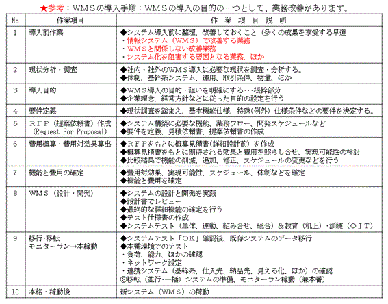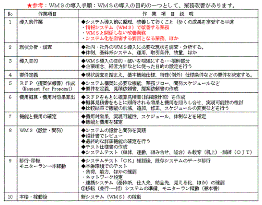 複数のWMS仕入先を対象にRFP(見積依頼書、提案依頼書)を基本に説明会(現説)を開催、その結果で、WMS仕入先(コンペ参加企業)から提案回答書(見積仕様書&見積書)を入手します。提案回答書のフォーマットは、横並びで比較検討し易いように各社同一とします。RFPにとらわれず、参加企業の実績やノウハウを駆使したVA(価値ある)提案も別途依頼したいものです。(コンペ参加企業は、3~4社に絞るのが望ましい)導入のポイント&チェック項目として、要件定義とパッケージシステムの機能(プロセス毎)の乖離度をチェックすること。また、ハード、端末などの仕様などを綿密に確認すること。コンペを実施した場合、参加企業毎の導入する基本パッケージシステム費(ライセンス、標準、オプション、etc)、カスタマイズ費、ランニング費、ハード機器費、据え付け配線工事費、システム調整費、保守費(ソフト、ハード)、etcなどの内容と価格を綿密にチェックすると共に、疑問点や質問を質問書にしてコンペ参加企業全社にもオープンにすること。機能の拡張性が高いことも重要なポイントです。パラメーター数、設定などで変更できる項目などを比較、処理スピード(ex.在庫引当時間、ディスプレイ表示時間)の確認なども検討対象としたい項目です。作業者にストレスを与えないために人とWMSのやり取りのレスポンス(応答時間)の速さを重視したいものです。(アイテム数10万点以上の物流センター(倉庫)のレスポンスをMAX3秒以内と指定した経験がございます。)細かい項目になりますが作業やオペレーションの変化に柔軟に対応できるようにパラメーターやフラグで任意に変えられるシステムが望ましいと思っています。さらに、導入実績を重視すること、導入実績(業種・業態)の多さは、良いパッケージシステムの選択に繋がります。同業他社に多数の導入実績があれば、同業種の課題や必要な機能が標準装備されていることが想定(しっかりと確認すること)できます。どの業種を中心に導入経験が多いか、標準機能の充実、使い勝手が良く自社の業務要件に照らして利用が可能か否かの説明を十分に受けること(お願いすること)をお勧めします。最後に、保守体制がしっかりしていること、保守要員(ソフト、ハード)が30~60分位で駆けつけられる距離に所在していることが望ましい、導入後のサポートレベルが重要です。特にWMSについては、不具合時の対応など、導入後も供給先との付き合いが続きますので供給先サイドの担当者の能力や人間性も重要な選定ポイントになります。