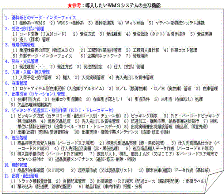 WMSは、物流管理部門、物流現場部門の改善・改革のための独自のシステムであると同時に物流企業、物流部門にとっての戦略的ツールという側面も持っています。 私は、WMSが存在しなかったサラリーマン時代に現場と密着した情報システムが欲しくて基幹系と制御系システム(汎用OSを組み込み)を仲立ち(データインターフェイス)に物流現場の情報管理システム(WMS機能)を手掛けました。東洋一と言われた大小様々の自動車用サービス部品の物流拠点(倉庫)の物流現場の作業のニーズ、効率化と品質・精度、処理タイミングなどを前述の制御系システムに委ね、開発、導入に悪戦苦闘した経験があります。導入に当たってはシステムやハードの技術面だけでなく物流、営業、仕入、納品先、企画、関連部門との物流的な視点での取り組み課題、先々の業界の動向、仕入先や納品先から求められている条件、求めたい条件などを社内外からの知見を得て、物流実務面を主体にしたサービスや品質などの現状レベルの把握、分析をしながら課題改善と将来に向かった業務要件の取り込みに取り組みました。WMSの開発時の準備(業務要件など)には、関係スタッフ、現場部門の意向、意見を十分吸収して反映させることは勿論、企業全体に影響する調達、在庫管理、輸配送などの複数部門の利害関係を踏まえた上での前向きな視点が必要でした。WMSの導入や開発の目的、狙い、物流機能の有り方などを社外(仕入先、納品先、輸配送、etc)、社内部門との共有(前工程NG、後工程OK、又はその逆の繰り返し)で進めることが肝要でした。全てにおいて全部門の最適化が望まれますが完全・完璧はありません。部門毎の落とし所を見極めて最終妥協点の改善目標を設定して取り組むことがポイントになることだと考えています。