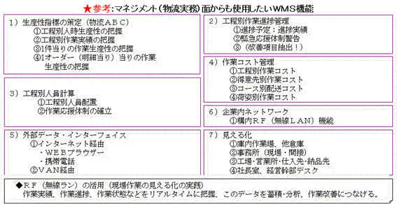 WMSの使命は、正確な在庫の維持、生産性の向上、ミス防止などをサポートすることがコスト抑制に繋がります。また、複数拠点やエリア、ゾーン毎の在庫をリアルタイムに把握できること、作業の進捗をリアルタイムに把握すること、EDI(ASN、出荷指示、完了報告)などの組み入れ、刻々と変動する在庫状態や作業進捗状況を遠隔地でも確認(照会、配信)できること、商品の追跡可視性(トレーサビリティ)の確保など、WMSは、リアルタイム性と可視性を支援するツールとしてのマネジメント能力の向上が重要なポイントになってきました。さらに、物流の変革で物流センター(倉庫)独自の現場管理が必要になってきています。商物分離、アウトソーシングなど、日々の作業管理の中での作業情報(商品改廃、在庫、ロケメンテ、日付管理、先入れ先出し、etc)の管理、物流現場のデータ収集、分析などの必要性が高くなってきています。日々の変動している物量に応じた要員配置、的確な運用、益々高い品質や納品精度を求める厳しい(当然ですが・・・。)小売業が増えて来ました。そして、小売業毎に別々のOPが求められるようになってきました。さらに、店舗の販管費の省力化、検品、品出し、業者集約、機能集約などを小売業の改善策としての物流の改善改革が求められています。 物流センター全体の運営管理の精度向上が取引条件として必要になってきました。納品データの保証と高い納品精度、納期の遵守、納品業者別に損益管理を追求するためのカテゴリー別納品、庫内現場作業のコスト削減、情報と現品在庫の一致、過剰在庫の撲滅(市場出荷動向に合わせた在庫量の適正維持)、継続的な改善活動を支えるデータ収集(システム支援)など、数え上げればWMSの必要性はきりがありません。そのような条件下で基幹系システムでは、とてもとらえられない現場の生のデータをリアルタイムに活用した収集の独壇場としてWMSが利用されています。