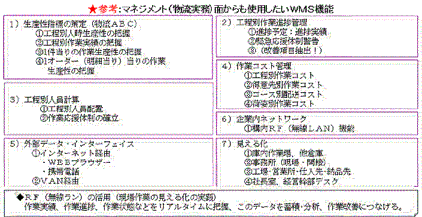 WMSの使命は、物流実務の生産性が出せる仕組み、ミスが起きない仕組みが必須条件です。コスト抑制は、作業工数を圧縮することが重要、また誰が作業してもミスが起きない仕組みとして、未熟練者でも一定の精度と生産性が出せる仕組みが求められます。関係者が在庫や作業状態をいつでも見られるようにリアルタイム性と可視性を支援するツールとしてのWMSが不可欠になってきています。先ず、複数ヶ所在庫や拠点別在庫をリアルタイムに把握出来ること、作業進捗をリアルタイムに把握出来ること。作業者がいつでも確認できるように現場表示(端末、アンドン,etc)が行えることです。EDI(ASN、出荷指示、完了報告)を組み入れること、インターネットの活用(刻々変動する在庫状態や作業進捗状況を遠隔地(営業や仕入・購買部門)からでも照会、配信を可能にすることです。