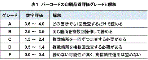 バーコードを企業間の情報伝達に利用する場合には、一定の品質水準を確保する必要があり、バーコードの印刷品質評価基準としてISO/IECの国際規格として定められ、JIS規格も作成されている。印刷品質の評価には、高い順にグレードA、B,C,D,F(数字で表す場合は4.0~0.0)の5段階がある。また、企業間で流通するバーコードには、原則として、グレードC(1.5)以上の品質が求められる(各グレードのバーコードの品質の解釈は表1を参照)。 ただし、段ボールに直接IJPで印字されたバーコードについては、これまで社内での利用が中心であったことなどから、こうした規格や印刷品質についての配慮が浸透していない。しかし、将来、企業間で活用を進めていく場合にはバーコード品質に十分留意する必要がある。