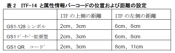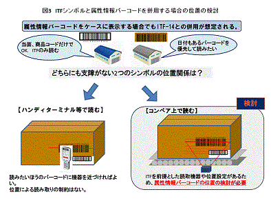 将来、属性情報バーコードを企業間で活用する場合においても、現在広く利用されており、マテハンシステムにも組み込まれている、ITFシンボルの表示をなくすことは考えづらく、2種類のバーコードの併記して運用することが必要となる可能性がきわめて高い。
