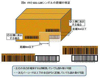 この結果から、表2に掲示した距離の範囲内に属性情報バーコードを表示すれば、ITFシンボルも、属性情報バーコードも、問題なく読み取ることができそうである。また、バーコードの左右の余白(QRコードの場合は上下にもある)を侵食しない限り、ITFと属性情報バーコードを近接させても読取りは可能である。なお、今回の検証では、ITFの左側に属性情報バーコードを置く場合、ITFから離す上限を設定した。しかし理論的には、搬送ライン上を動く段ボールに印字されたバーコードが一定のスピードで読取機器の視界に入ってくるとき、これ以上離れていても問題はない。*画像をClickすると拡大画像が見られます。