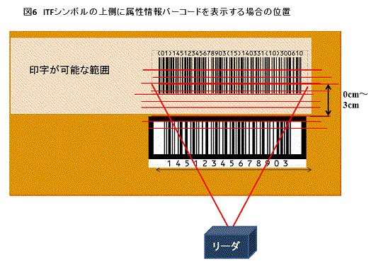 ITFシンボルは、物流センターのソータ等で読み取ることを前提に、決まった位置に印字されている。属性情報バーコードも段ボールに表示した場合、商品の入出荷においては、ハンディターミナル等で読み取って賞味期限日付などの情報を取得するという利用がほとんどだと予想される。この場合、読取機器を読みたいほうのバーコードに近づければ読み取れるため、探し易さに配慮すれば、属性情報バーコードの位置は特段、問題にはならない。ただし、企業によっては、将来、現在ITFシンボルが読まれているのと同じように、物流のコンベア上を流れている段ボールに表示した属性情報バーコードを読み取る可能性もあると考えられる。このため、新たに属性情報バーコードを読み取ってケース単位の商品識別コードとともに、日付等の付加情報も利用したい企業も、また、従来通りITFシンボルを読んで商品識別コードだけを利用したい企業も、ともに支障なく利用できるような属性情報バーコードの位置を確認することが必要である。*画像をClickすると拡大画像が見られます。