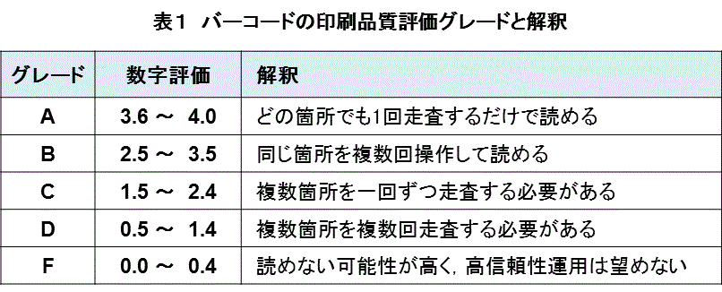 バーコードを企業間の情報伝達に利用する場合には、一定の品質水準を確保する必要があり、バーコードの印刷品質評価基準としてISO/IECの国際規格として定められ、JIS規格も作成されている。印刷品質の評価には、高い順にグレードA、B,C,D,F(数字で表す場合は4.0~0.0)の5段階がある。また、企業間で流通するバーコードには、原則として、グレードC(1.5)以上の品質が求められる(各グレードのバーコードの品質の解釈は表1を参照)。 ただし、段ボールに直接IJPで印字されたバーコードについては、これまで社内での利用が中心であったことなどから、こうした規格や印刷品質についての配慮が浸透していない。しかし、将来、企業間で活用を進めていく場合にはバーコード品質に十分留意する必要がある。