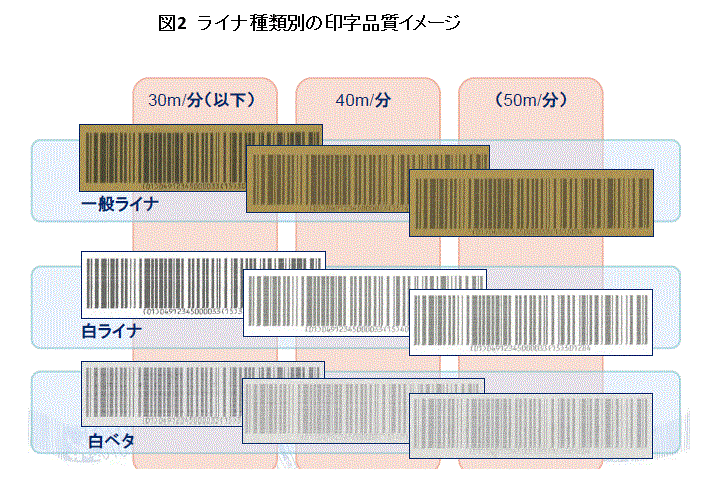 図の1は、ライナの種類別に、どのような品質グレードのバーコードが印字できたかを棒グラフで表したものである。白ライナは表の紙が白いもの、一般ライナは茶色のものである。また、「白ベタ」は、一般ライナの上に白色を印刷したものである。段ボールの価格としては、高い順に白ライナ、白ベタ、一般ライナとなる。印字の結果、白ライナにおいては、サンプルの90%がグレードC以上であった。また、最も広く流通している一般ライナに印字したサンプルは9割がグレードDという品質であった。グレードDとなった最大の要因は、一般ライナの素材の色が茶色であり、バーコードのスペース部分(白に近いほどよい)が暗くなることから、属性情報バーコードのシンボル・コントラストが十分にとれないことが主な要因と考えられる。図2は、ライナの種類および印字の搬送ラインのスピード別に、代表的な印字サンプルの画像を比較したものである。印字スピードが速くなると、印字が少し薄くなることが確認できる。30m/分と40m/分では、少しインクが薄くなるが、当初予想と異なり、品質の差は無視できるレベルであった。実際の段ボールの製函・商品詰めのラインで50m/分で動くものはごくわずかであり、50m/f分のスピードに対応しないIJP機器も多いとのことだが、参考程度に実施した。*画像をClickすると拡大画像が見られます。