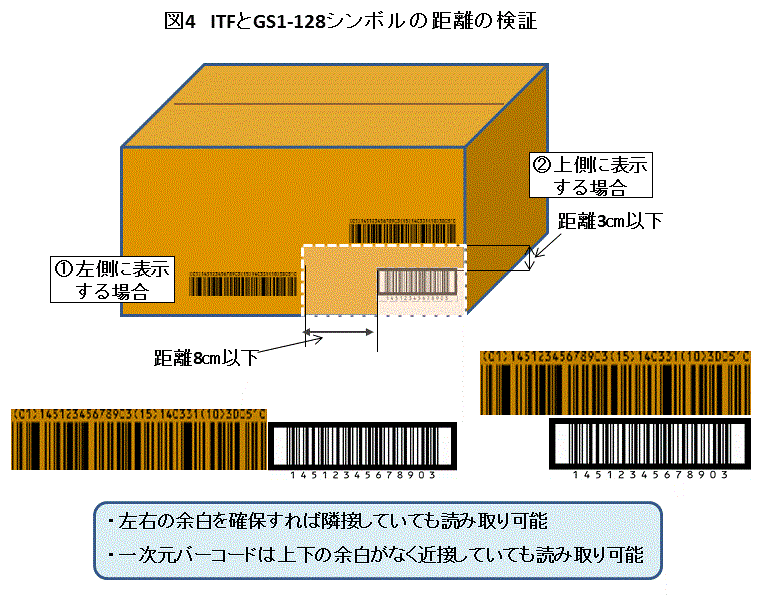 この結果から、表2に掲示した距離の範囲内に属性情報バーコードを表示すれば、ITFシンボルも、属性情報バーコードも、問題なく読み取ることができそうである。また、バーコードの左右の余白(QRコードの場合は上下にもある)を侵食しない限り、ITFと属性情報バーコードを近接させても読取りは可能である。なお、今回の検証では、ITFの左側に属性情報バーコードを置く場合、ITFから離す上限を設定した。しかし理論的には、搬送ライン上を動く段ボールに印字されたバーコードが一定のスピードで読取機器の視界に入ってくるとき、これ以上離れていても問題はない。*画像をClickすると拡大画像が見られます。