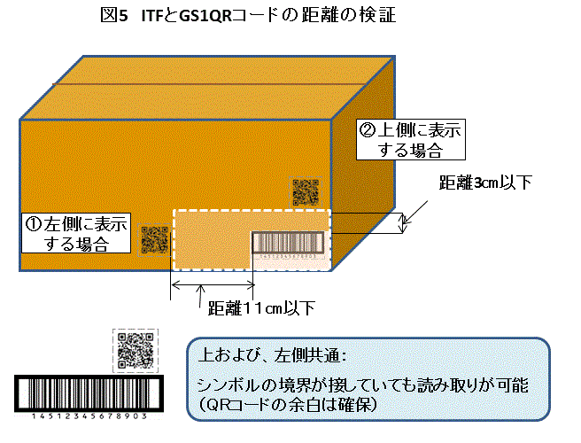 将来、属性情報バーコードを企業間で活用する場合においても、現在広く利用されており、マテハンシステムにも組み込まれている、ITFシンボルの表示をなくすことは考えづらく、2種類のバーコードの併記して運用することが必要となる可能性がきわめて高い。