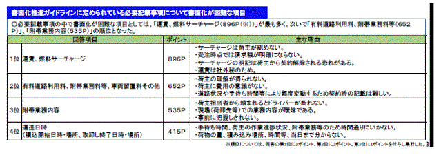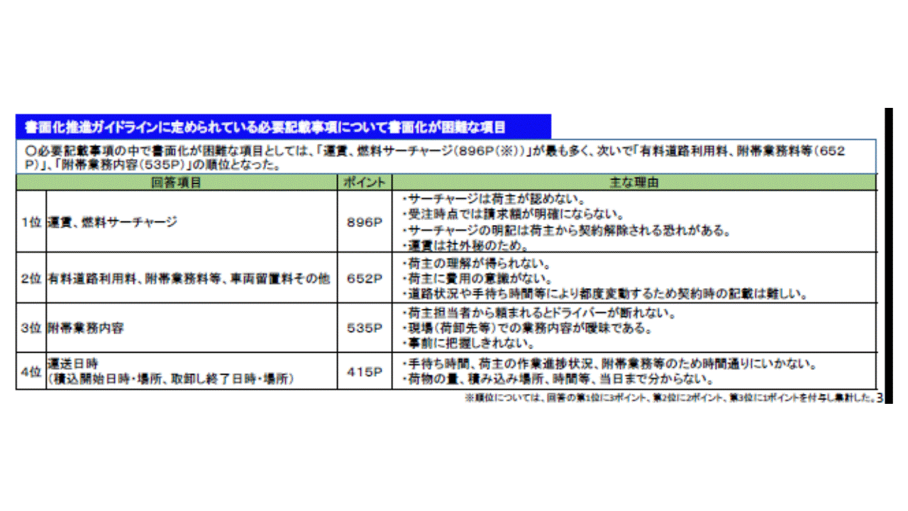 本来、このような項目は、運送契約書や覚書、運送状等において明示されるべきものであるが、(1)-①のような取引慣行として口頭で済まされているのが実態であった。