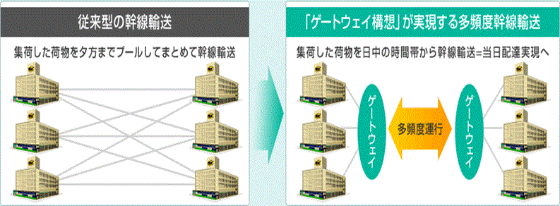 ヤマトは中間に「ゲートウェイ」と呼ばれる巨大ターミナルを経由させることによって、この課題を解消しようとしているようだ。これが「ゲートウェイ構想」である。ゲートウェイは、すでに羽田(お馴染みの羽田クロノゲート)と厚木に設置、さらに中部、関西地区にも設けられる。少数のゲートウェイに集約された貨物により、ゲートウェイ間を走る幹線トラックの積載率は自ずと向上する。