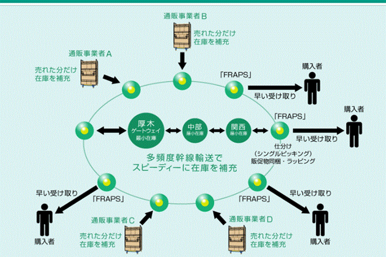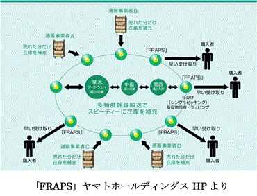 事実、同社はバリュー・ネットワーキング構想の中で、「止めない物流」と並んで「クラウド型のネットワーク」を提唱している。「クラウド型のネットワーク」は、最寄りの宅急便拠点に少量の在庫を分散し、在庫を圧縮しながら通販の顧客など複数の相手に届ける仕組みである。独自規格の流動型ラックを用いたソリューション「FRAPS(Free Rack Auto Pick System)」を利用すれば、全国各地の顧客へ商品を素早く配達できるうえ、倉庫や人手など自社の資源を極力使わずに済むため、固定費を減らしてトータルコストを削減することができる(同社HPより)。自社で物流センターを保有するほどの規模を持たないネット通販業者の「当日配送」を想定した商品である。