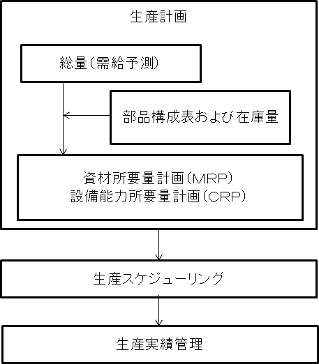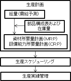 ものづくり情報システムの基本的な流れは、市場へ供給する製品の種類と数量を策定する生産計画に始まり、部品構成表および在庫をふまえた資材所要量計画(MRP)や設備能力所要量計画(CRP)の作成を行い、生産を実施する時間的日程を作成する生産スケジューリングをふまえた生産指示が行われ、生産計画と実績の差異を修正する進捗管理を行うといった活動から構成されている(図1参照)。