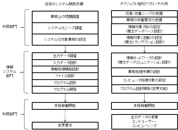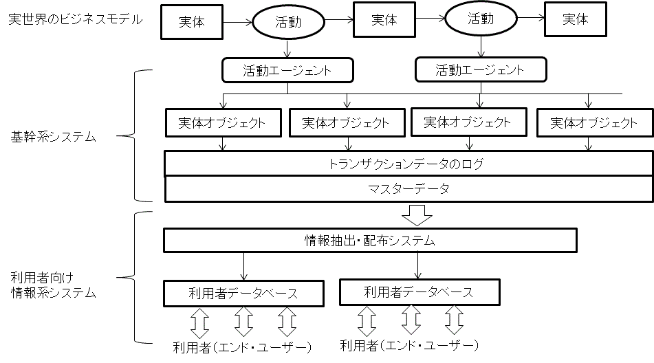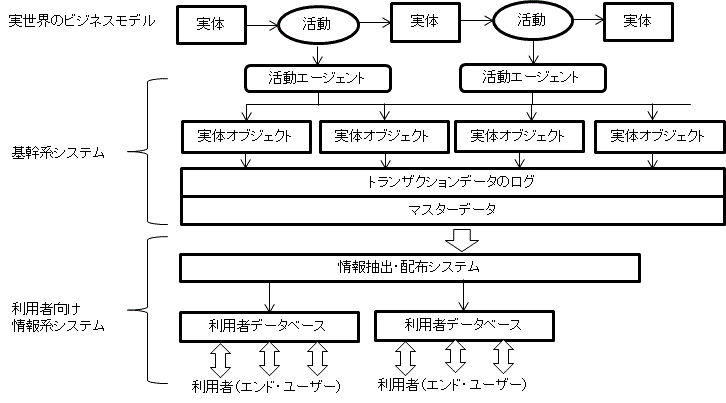 そこでは、システム化の要求仕様にもとづいてデータ処理のアルゴリズムに沿ったプログラム開発を行うソフトウエア工学手法ではなく、利用部門における業務処理の必要性や課題解決に必要なコミュニケーション手段としての情報システム工学が適用され、業務の実態を記述するための手法が開発・適用され、基幹系システムを構築するという手法が適用された(図3参照)。