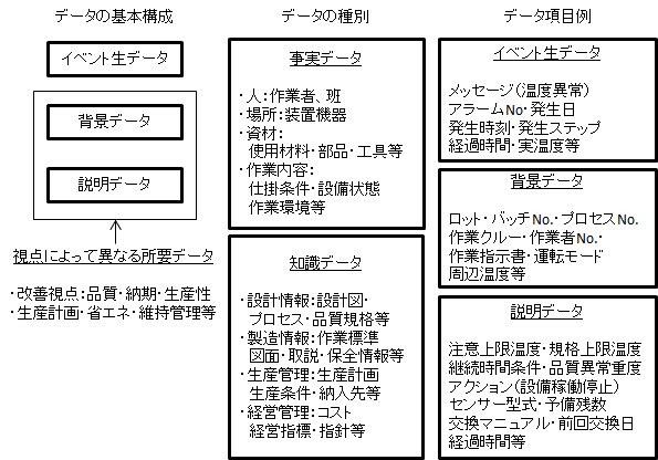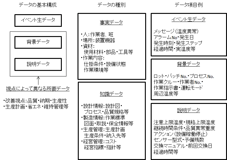 この手法のコアとなる要素技術は、情報短冊(CTM: Con Text Message)による情報収集・分析・活用にある。わかりやすい例示として、ものづくり現場におけるトラブル感知の事例にみる情報短冊の構成をみると、大きく、生データの記述とその解析や判断に必要となる背景データ、説明データから構成されている。