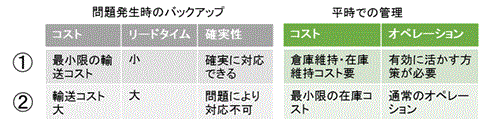 ①のケースは有事に備えて常にある一定の在庫を抱えておく必要があり、その様な在庫が直ぐに供給できる場所に倉庫が無い場合は、新たに設置しコストを掛けて維持していかなければならない。また②のケースでは、既存のSCLを利用するため、平時での管理コストは最小限に抑えられるが、物流チェーンが寸断された場所によっては対応できない場合もある。