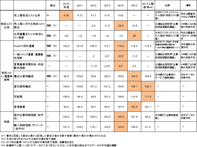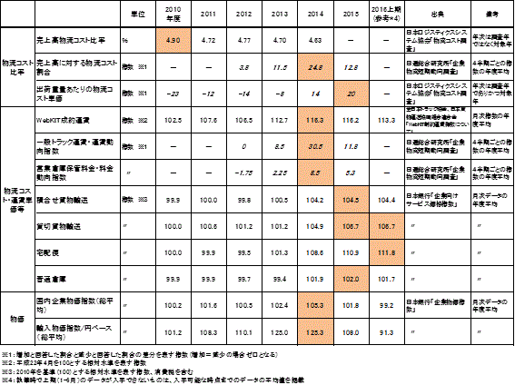 図表1は、物流コストに関する主要な統計データを整理したものである。ここでは、国の統計データの他、民間の調査機関・団体による主要な調査データを引用している。なお運賃料金などの価格動向については、下記に挙げた以外にも民間ベースで公表されている資料が色々とあり(例えば倉庫賃料の相場など)、参考とすることができる。