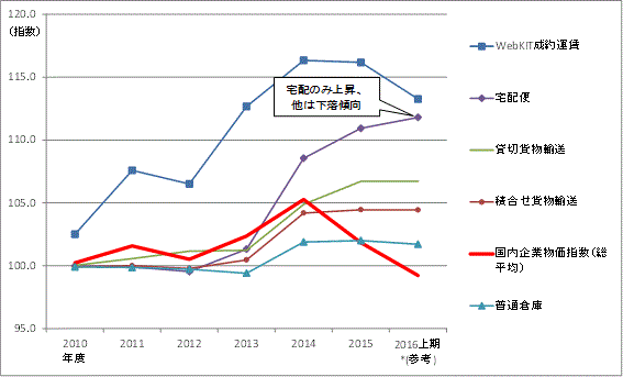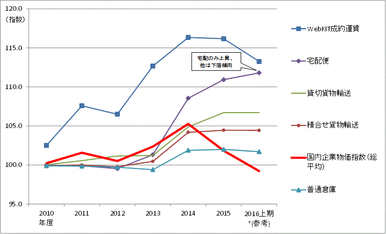中国経済の停滞や為替水準が円高にシフトしたことによって、景気の停滞傾向が強まっており、国内貨物量も減少傾向が強まっている。そのため、主として需給要因で上昇を続けてきた運賃・料金などについては、価格上昇圧力が低下している(近年のトラック運賃上昇は、燃料価格上昇などの「コスト・プッシュ型」ではなく、需給の逼迫による「デマンド・プル型」の値上がりであるため、需給による価格への影響が大きい)。