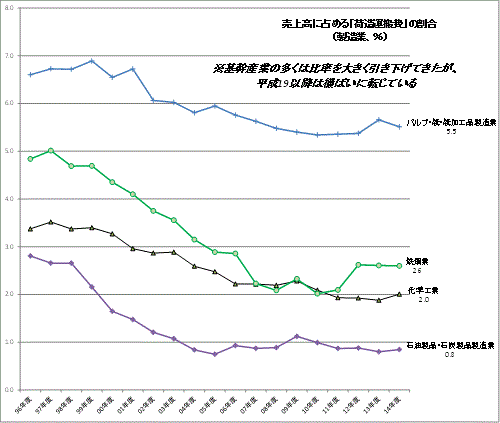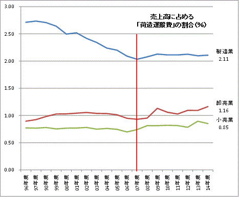 即ち、製造業で見ると、2007年度まではコスト比率の低下が続いたが、2007年度を境にコストの低下が止まり、横ばいないし上昇傾向に転じている。卸売業、小売業については、2007年度以前からコストは下がっていなかったが、やはり2007年度ごろを境に、上昇傾向が強まっている。直近(2015年度)のデータは未公表であるが、傾向的にコスト比率が低下しているようには見られない。