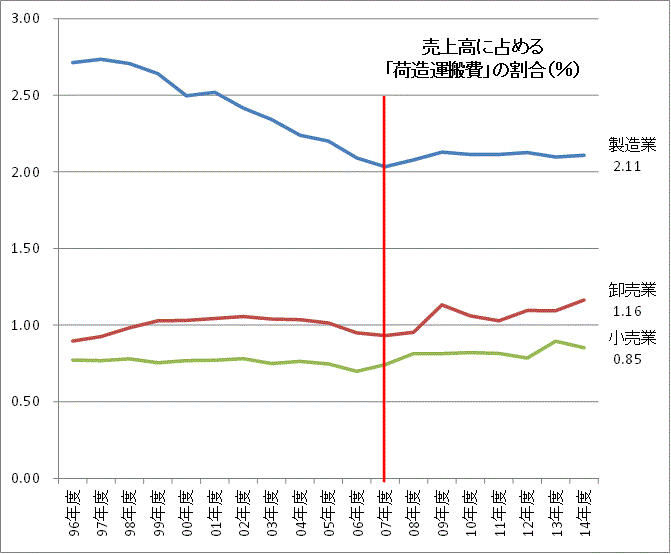 図表3は、「企業活動基本調査」を元に製造業、卸売業、小売業という業種大分類別に荷造運搬費の割合を整理したものである。物流コスト全体ではないため、コスト比率がやや低い値となっていることに留意が必要であるが、時系列の傾向がクリアに現れている。