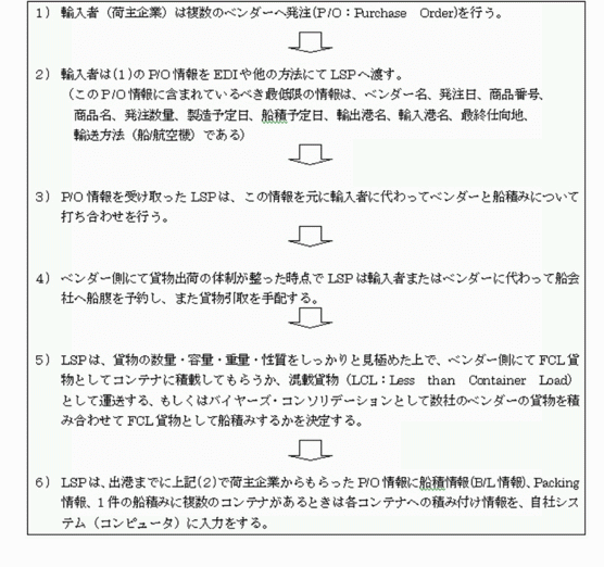 このベンダー・マネージメントを簡単に説明すると、LSPは輸入者がおこなった工場への発注情報を輸入者から全て入手し、その情報を元に輸出地にて各ベンダーから貨物を集荷して輸出通関を行い、船積みを行うというものである。ここでのポイントは、物流についてはLSPが輸入者に代わって全てコントロールするという事であり、LSPは物流に関しては輸入者側から全権委任されていると解釈することが出来る。
