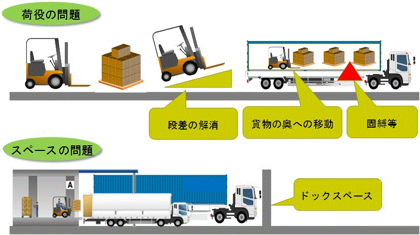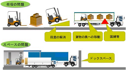 細かくみて行くと、バース形状の問題、ウイングトラックによる低床式の倉庫内荷役への適用(ドックレベラー等の導入が必要となる)、ドライバーの荷役範囲の違い(ドレージとその他での荷役の担当範囲が異なる)など、色々な問題が指摘される。