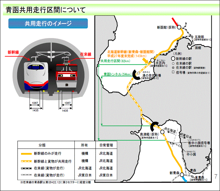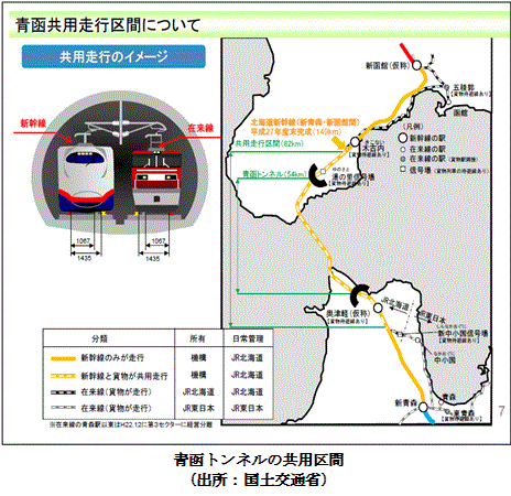 北海道新幹線が津軽海峡を超える際に通る青函トンネルは在来線との共用区間である。在来線と同じ線路を走るわけだが、新幹線と在来線の線路の幅は違う(新幹線の方が広い)ので、在来線のレールの外側にもう一つ新幹線用のレールを加えた「三線軌条」により共用を行う。問題はこの路線に貨物列車も走るという点である。
