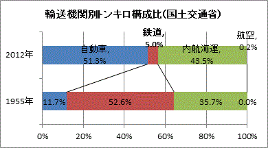 現在、国内輸送機関に占める割合は、トンキロ(輸送トン数×輸送距離km)でわずか5%にすぎない。