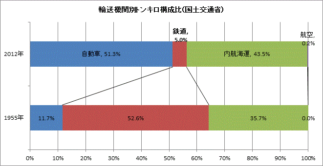 ところが昭和30年(1955年)の統計によれば、当時国鉄が担っていた鉄道輸送はトンキロで52.6%、トラックは11.7%である。