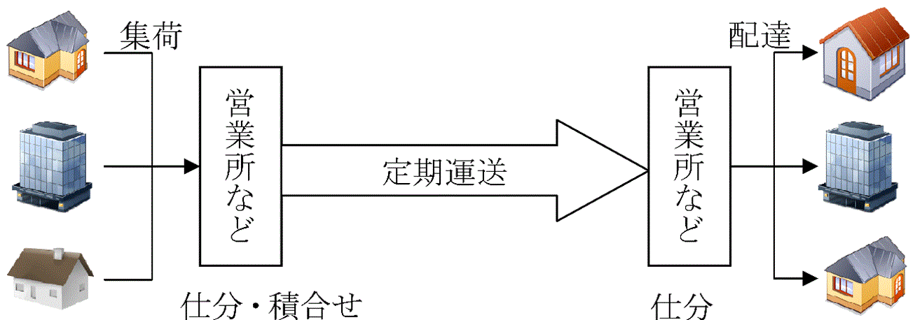 特別積合せ貨物運送を図示すると、以下のようになる(図1。以下、業界用語にならって「特別積合せ貨物運送」を「特積み」という)。