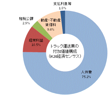 物流業は労働集約的であり、総費用に占める人件費の比率が高いが、なかでもトラック運送業は、①他と比べて利益率が低い、②地代等の負担が少ないといった特徴がある。そのため、付加価値額に占める人件費の比率が極めて高い。