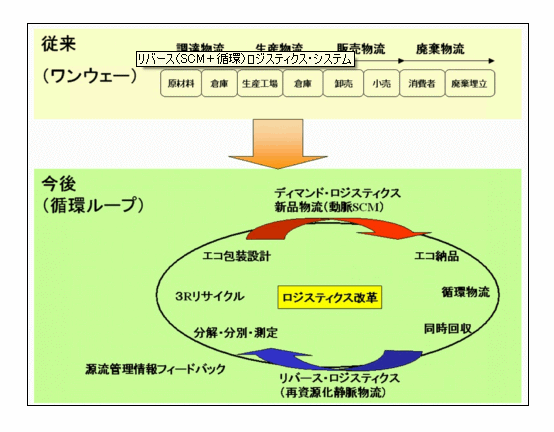 現在物流業界で話題になっている、材料部品メーカー段階から最終製品メーカー・卸売業・小売業店頭段階に至る、新しい商品を消費者に届けるディマンドチェーン(SCMサプライチェーン)物流に加えて、さらに地球環境対応や有限資源の再活用の為のリバース循環物流である(これらは、回収物流とか、人体の血液流に例えて静脈物流とも呼ばれている)。