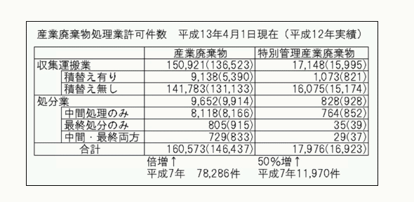 廃棄物の抑制・減量・再利用を進める為、政府は平成12年「循環型社会形成推進基本法他全6法」を制定、目指すべき持続可能な社会の姿を明示、迅速な構造転換を推進している。この動きに呼応するように、産業廃棄物処理業(収集運搬業と処分業)への参入が相続き、特に収集運搬業は6年間で倍増と、顕著な伸びを示している。