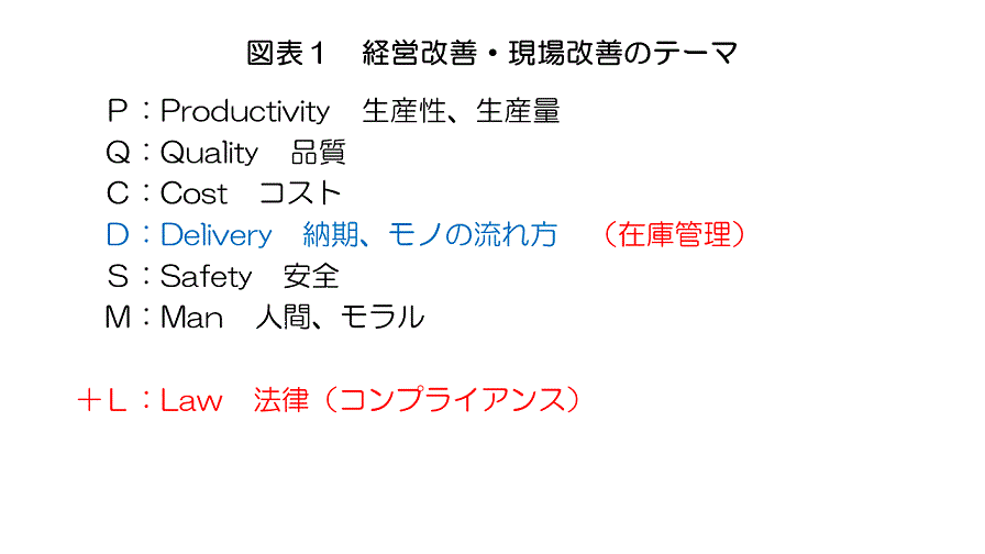 現場改善のテーマとしては、図表1のようにP・Q・C・D・S・Mが挙げられる。テーマ選択の順序がこの通りでないことは言うまでもない。