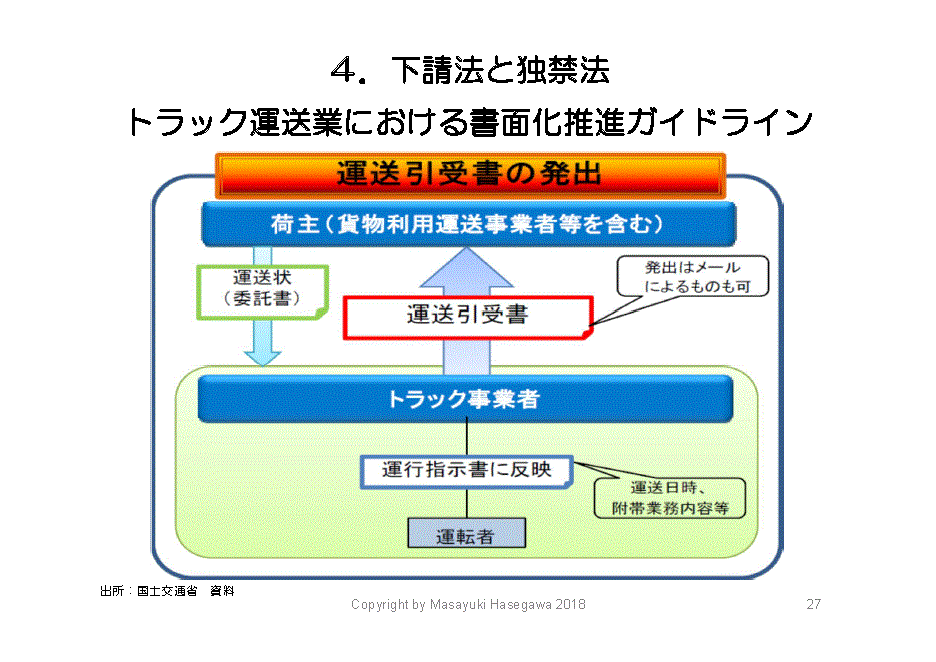 もう一つは、書面化の推進です。先ほどのような「東京から大阪から10トン車1台頼むよ」、「はい、わかりました」という電話だけでは、後から「言った、言わない」のトラブルもあり得ます。そこでメールでもよいので取引書面を取り交わしなさいというのが、「トラック運送業における書面化ガイドライン」です。「書面化ガイドライン」は7割くらい普及していると言われています。