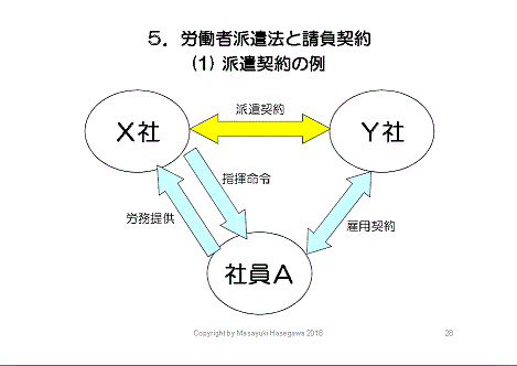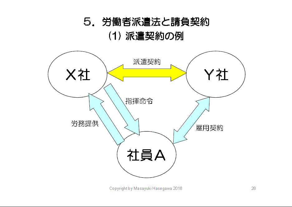 X社が、Y社という派遣会社に頼んで、Y社の社員AさんがX社物流センターで田中センター長(X社)から指揮を受けて働いている、これが労働者派遣法(派遣法)に基づく正しい派遣です。