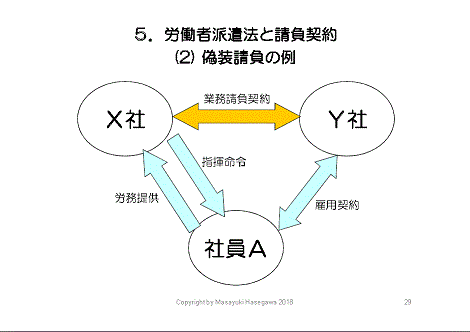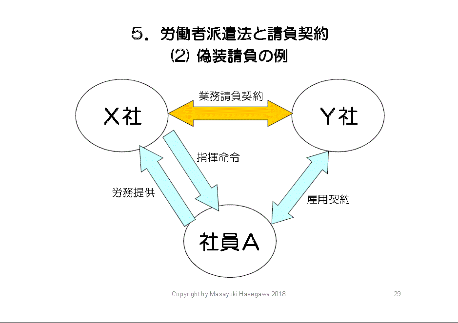 こちらの図は、正しくない派遣、いわゆる偽装請負です。X社は、派遣契約ではなく業務請負契約でY社にセンター業務を丸投げしています。