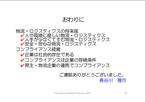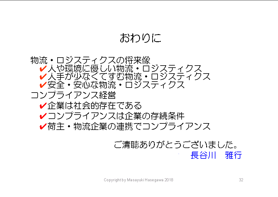 何より求められているのは、冒頭述べたたように、消費者からの目が厳しくなっているということです。安全で安心な物流・ロジスティクスを行える荷主企業と物流企業が生き残ることができる、言い換えれば企業の存続条件になると思います。まず存続がないと、成長も発展もあり得ません。