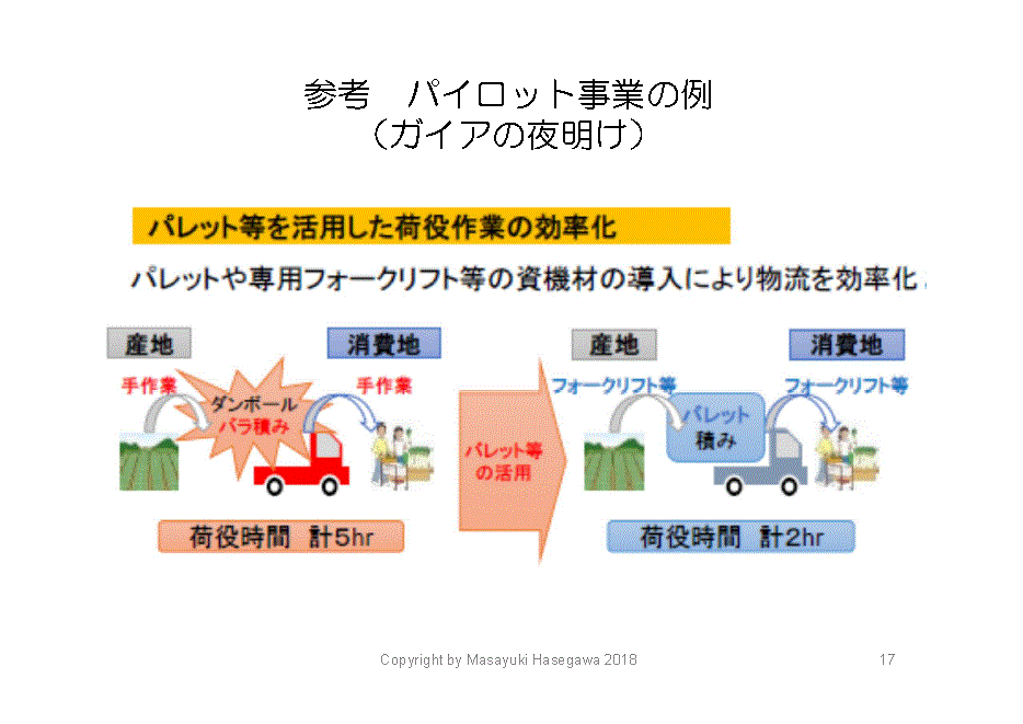 このケースではドライバーの労働時間が3時間減りましたが、先ほどの図表でレタスを1200ケース下ろす作業も同様で、1個1個手作業で降ろすことや、積みこむこと考えたら、それだけドライバーの疲労度も大きく違い、安全運転にもつながると思います。こういった取り組みが、徐々に進みつつあります。