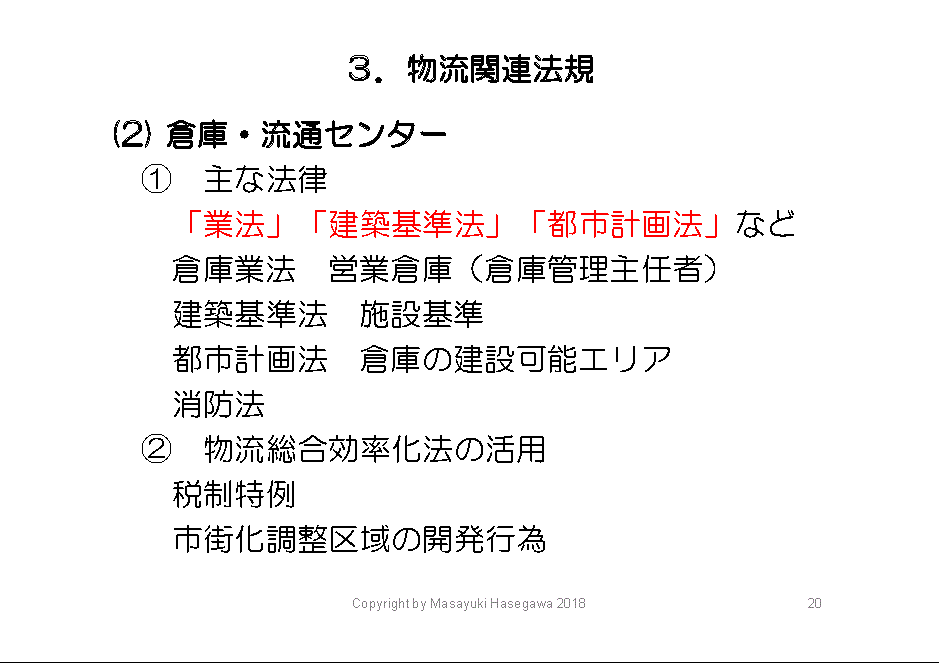 倉庫業法は、倉庫業(営業倉庫)について定めた法律で、貨物の寄託については、それぞれの倉庫に、倉庫管理主任者を配置すること等が定められています。建築基準法は、顧客の大切な貨物を預かるために、壁の強度などの施設基準について定めています。都市計画法は、倉庫を建てて良いかどうかという営業倉庫等の立地について定めています。例えば、住宅地はダメで、準工業地域・工業地域であればOKです。