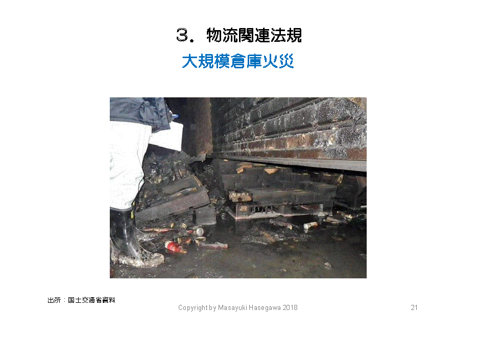 物流センターの関連法規には、消防法も関係します。これは昨年、埼玉県で発生した大規模倉庫火災の写真です。国交省のHPにも出ていますが、パレットがあったために防火シャッターが降りず、延焼してしまいました。