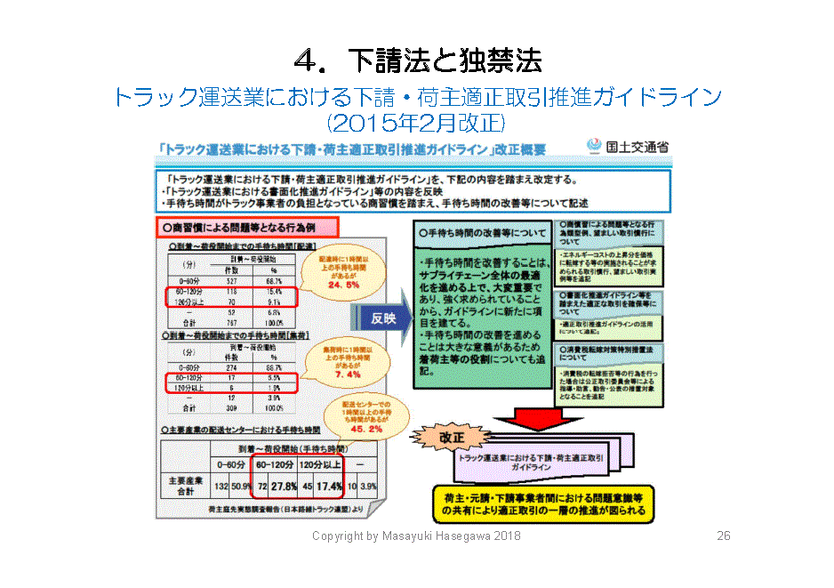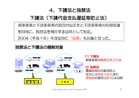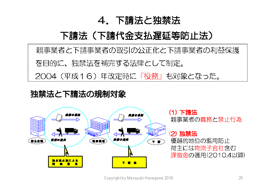 下請法は、製造業において中小零細の下請事業者を保護するため、60年以上前に制定された歴史のある法律です。14年前の2004年に、運送・保管サービスも対象になりました。さらに、トラック運送については「トラック運送業における下請・荷主取引推進ガイドライン」が作られました。自動車製造業・情報処理業など、各業界の特性に応じた適正取引の推進ガイドラインができています。
