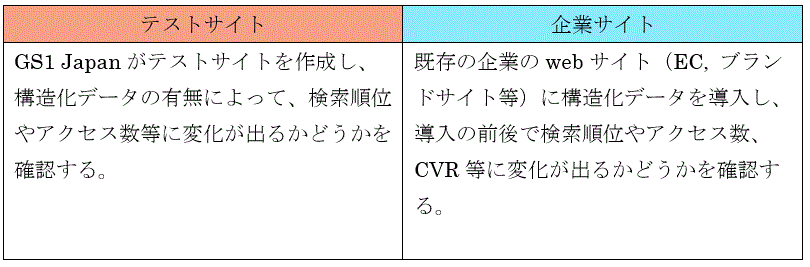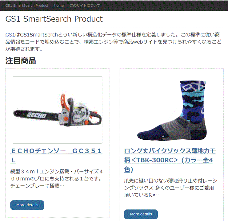 テストサイトにおける実証では、GS1 Web Vocabularyの構造化データを挿入したテストサイト実証参加企業が扱う実際の商品を掲載するwebページを作成した(https://gs1japanss.org/)。