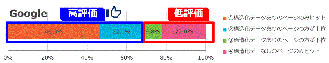 テストサイトによる検索順位検証の結果はGoogle検索の場合68.3%の割合で、Bingの場合は61.3%の割合で構造化データを含むGS1 Web Vocabularyが挿入された商品ページの方が、検索エンジンから高い評価を受けた。