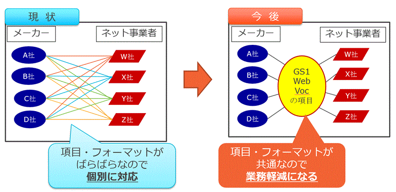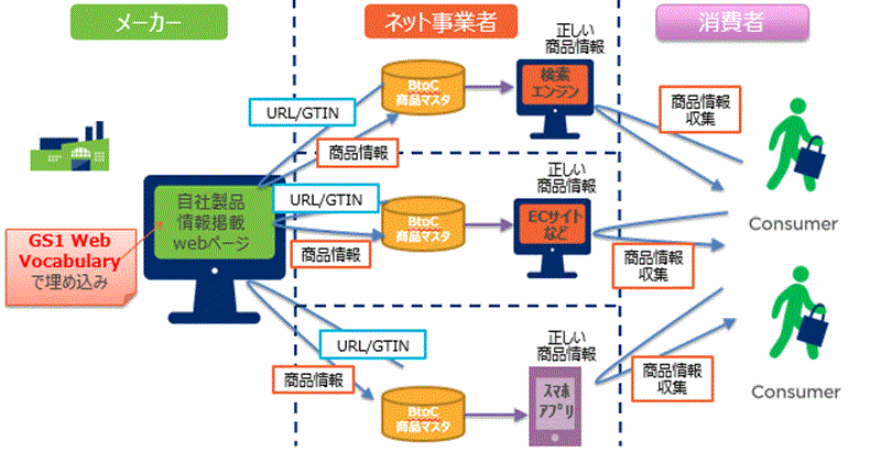 また、B2B2Cにおける商品情報授受なども技術的には可能である。現状では項目、フォーマットが乱立し不効率が発生している企業間の情報連携に対し、GS1 Web Vocabularyが標準として項目が用意されていることもあり、商品情報のスムーズな連携につながることが期待される。