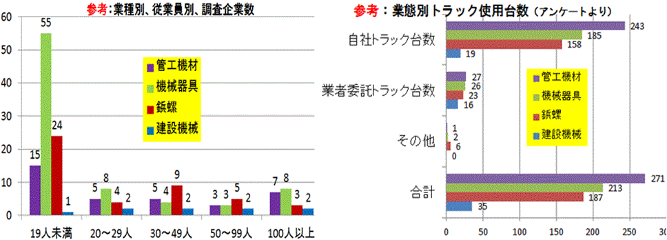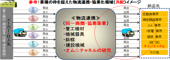 フィジビリスタディ(事業化調査)を対象にした中小企業は、重量・長大な特殊商材(荷物)をはじめ、一般の管工機材、機械器具、鋲螺、建設機械の中小卸でした。輸配送を中心に、保管、物流加工、グローバル物流サービスなどのあり方、納品先のニーズに合わせた中小卸としての強い結束を核に物流連携を実現していくべきと狙いを定めました。