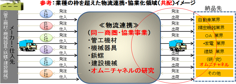 企業の目的は、利益を追求し、成果(利益)を上げることです。そのための方法は、売り上げを増やすこと、成熟した経済、及び長い間、競争相手が存在する業界に於いて売り上げを伸ばすことは、大変難しく、並大抵の努力では達成できないのが現実です。そこで、売り上げを増やす代わりに物流の連携・協業化でスケールメリットを享受できる条件づくりを行い、第3の利潤と言われて久しい物流費のコストダウンを狙いたいのです。技術や特別な製品、商材などを持たない中小卸にとって物流の連携・協業化は、大きなコストダウンの手段になると考えます。少子高齢化が目前に迫ってきています。そして、ボクシングのジャブの如く昔からある老舗の流通・物流・卸などの中小企業にじわじわと社会変革の波が押し寄せてきています。景気が上向き傾向にある中小企業にとっても今が変革のチャンス、将来を見据えた変革が求められているように感じます。超低金利時代ですが、長雨、寒さが影響していると言われ、生鮮野菜が高くなり、ちょっぴりインフレの傾向を感じるようになりました。インフレはともかく在庫を減らし、固定費の削減に取り組むとともに今まで培ってきた事業基盤を引き継ぎながら事業の変革をする時代が訪れているような気がします。現在の厳しい環境を背景に新たな成果物を生み出していかないことには、成長もなく生き残りの保証もされない時代となってきました。そんな環境を意識した管工機材、機械器具、鋲螺、建設機械の中小企業主体で業種の枠を超えて新たな事業展開で変革の時代を乗り越えるために物流連携・協業化の可能性を探る機会を10年前に頂きました。