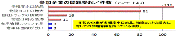 物流連携・協業化を目指している各卸企業の共通の課題・問題点は、①小口注文の増加、②個々の配達量の減少、③配達頻度の増加、④物流コストの増加、⑤交通事情の悪化、⑥事務処理の煩雑化、⑦その他でした。大手卸企業は、独自の物流・流通拠点を構えてコスト、サービス、生産性、品質・精度、納期順守、etcの物流実務を当然の如く実践していますが、中小卸は、単独で大手並みの売り上げ比率で投資、人材確保などは、難しい局面が多くあり、中小卸が協力して物流連携・協業化(特に配送業務)を実践することで前述の①~⑦の課題、問題点の改善・解消に努力していきたいものです。