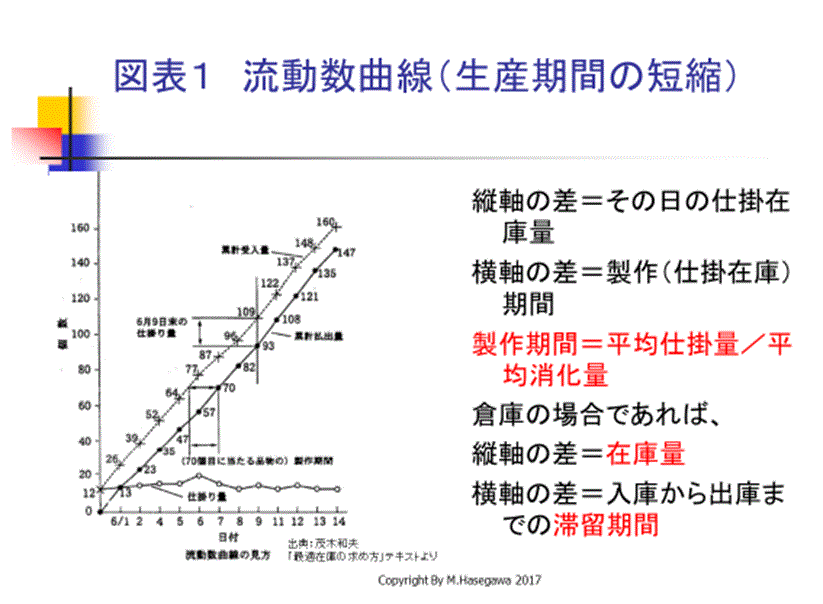 ヨコ線を引くと、二つの曲線のヨコの間隔が「製作期間」(仕掛品の滞留期間)を表すことになる。70個目にあたる部品材料は、製作期間にほぼ2日要している。