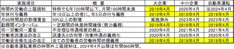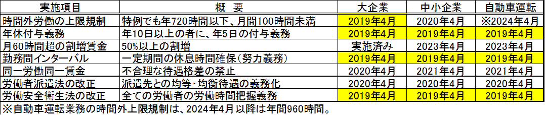 大企業・中小企業の分類は、中小企業法による(トラック運送業界は、99.9%が中小企業)。中小企業に対しては実情が勘案されて、改正内容の一部が大企業に遅れて施行される。しかし、後述するように準備期間が限られているので、早期の取り組みが必要である。