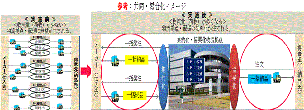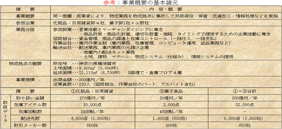 事業概要は、同一商圏・同業者の物流業務を物流拠点に集約し、共同で仕入支払、拠点内の受注、荷役、保管、流通加工、返品、棚卸、配送、情報処理などを指定された条件のもとで最高の精度・品質、納期、コストを実現することでした。